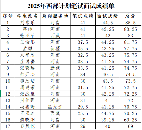 根据西部计划相关工作要求,为确保选拔工作公平、公正、公开,经个人报名、线上审核、笔试面试等环节,现将我校报名参加西部计划的人员笔试面试成绩进行公示,具体名单如下: