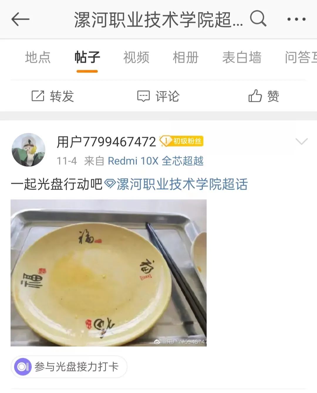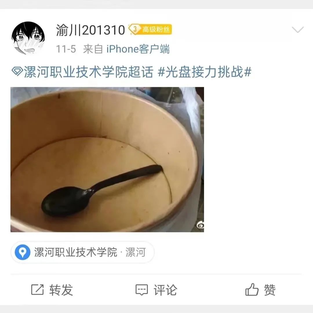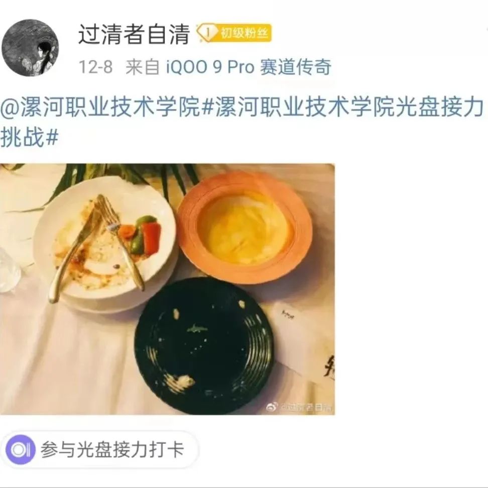 在共青团中央联合微博校园同步发起的#光盘接力挑战#活动中,学校党委高度重视,精心组织,suncitygroup太阳集团积极响应号召,以“光盘行动”精神为指引,开展了 “做节约粮食践行者”“光盘打卡”系列活动,各团支部踊跃参与其中,在校园中掀起光盘行动的热潮,同学们相互督促、鼓励和交流,利用饭后的休息时间积极拍照打卡,纷纷在微博中留下自己的光盘打卡足迹,成为节约粮食践行者,积累“麦苗肥料”,助力学校积分。