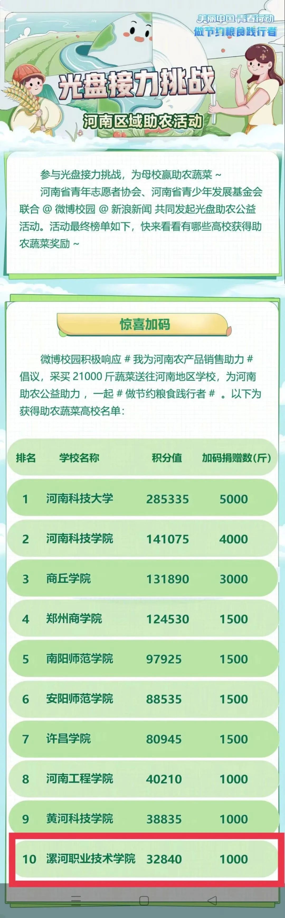 通过同学们坚持不懈的打卡助力,在11.28–12.4#光盘接力挑战#助农公益活动中,我校成绩显著,在全省高校公益积分增量排行榜中位列第十,并得到加码助农蔬菜奖励——1000斤大白菜。