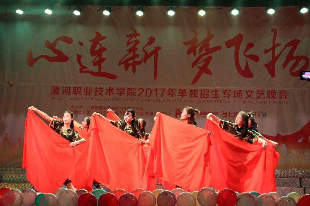 在优美的音乐声中,红色舞蹈《映山红》拉开了晚会的帷幕,婀娜的舞姿吸引了所有观众的眼球。在接下来的表演中,歌曲《一次就好》、《老男孩》展现了青年学子的无限活力,《青春偶像剧》、《舞蹈串烧》掀起了晚会的高潮。由院团委艺术团自编自导自演的小品《一张银行卡的故事》告诫同学们要注意人身和财产安全,不要贪图小便宜,“天上不会掉馅饼”,更要远离和防范“校园贷”。舞蹈《别把最疼你的人弄丢了》、《鼓舞漯职》、《舞出我人生》、《青花瓷》激情澎湃,活力四射。歌伴舞《我爱你中国》展现了同学们发愤图强、努力拼搏的奋斗精神。