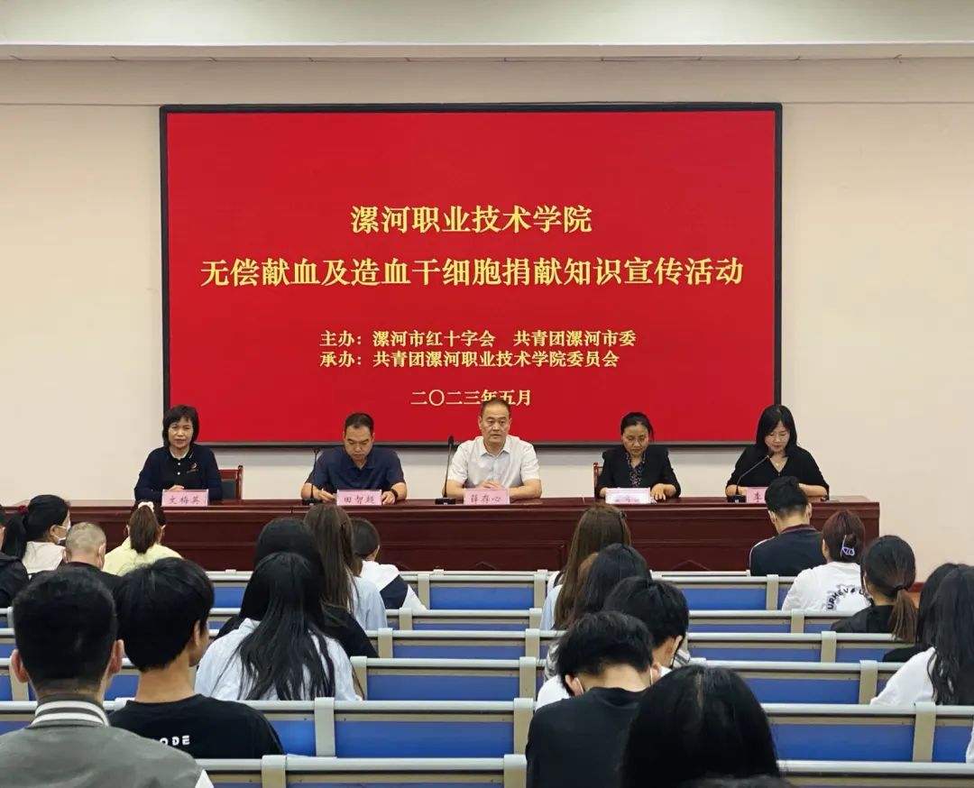 为弘扬“人道、博爱、奉献”的红十字精神和“奉献、友爱、互助、进步”的志愿者精神,鼓励广大青年学生崇德向善,通过参与无偿献血和造血干细胞捐献等活动,形成良好的思想道德素质和积极健康的人格,5月24日,由漯河市红十字会、共青团漯河市委和共青团suncitygroup太阳集团委员会联合举办的无偿献血及造血干细胞捐献宣传活动在2107会议室举办。学院党委副书记薛存心、团市委副书记田昊阳、市红十字会三级调研员董青慧出席会议。
